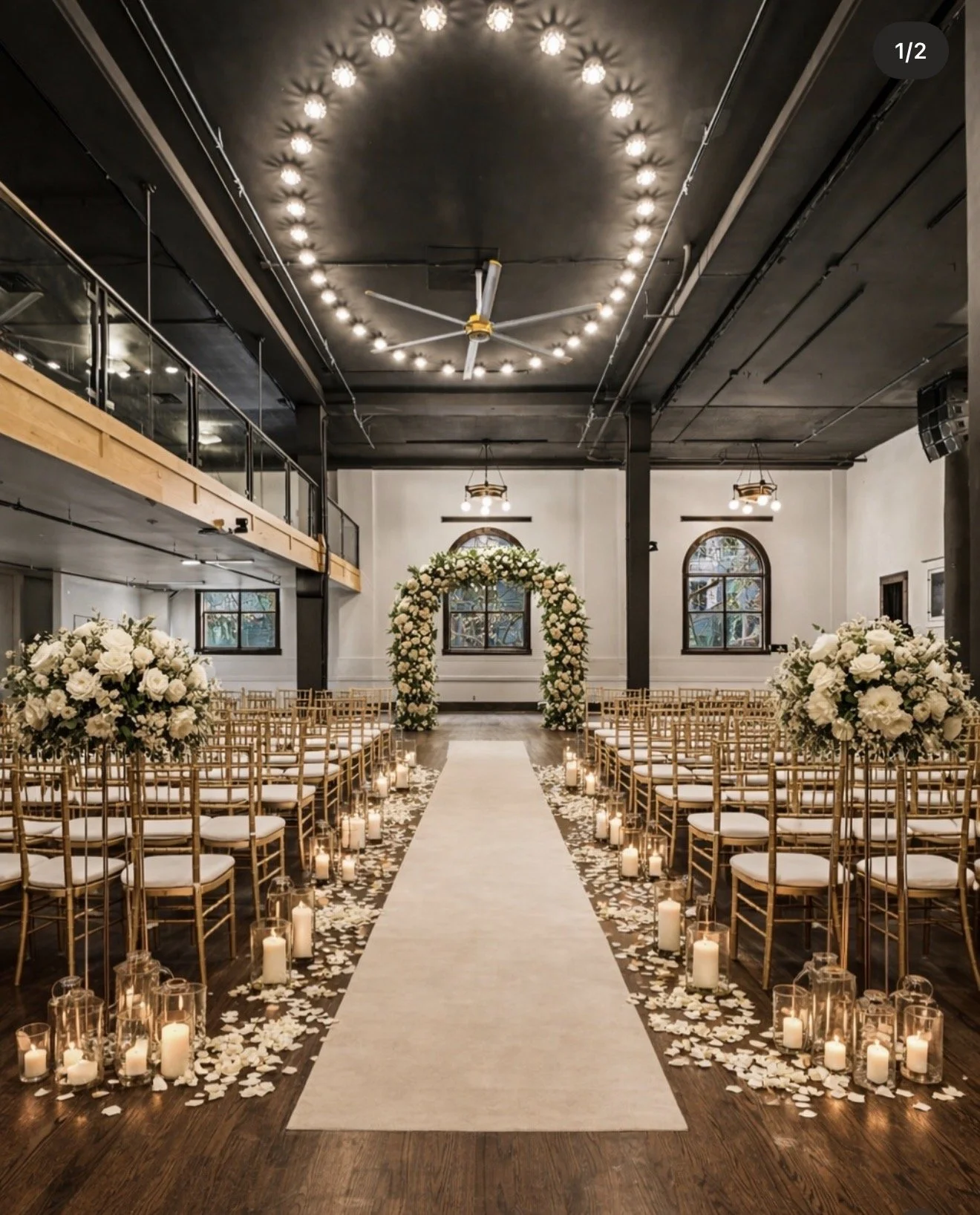 The theatre is oriented vertically — guests seated in rows facing the south end of the room, arbor set against the backdrop of the original springline windows. Natural light frames the ceremony from behind. This is the layout that makes the most of the architecture without using the stage at all.