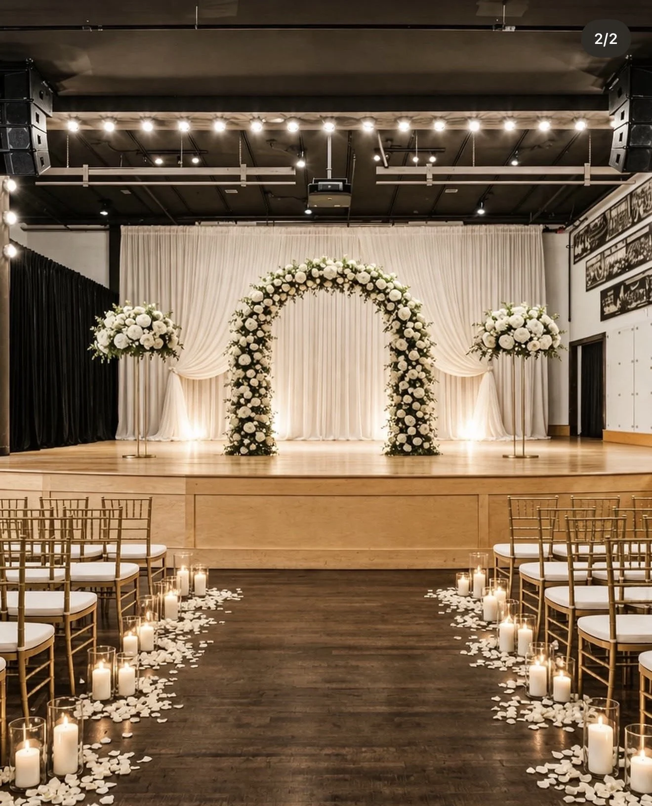 Guests seated in rows facing the built-in stage, arbor centered on the stage itself. The elevated platform gives the couple natural height and presence. The house lighting system frames the moment without needing additional uplighting.